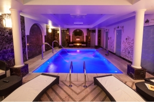 The hotel spa included a small indoor pool with warm wonderful water (about 80 degree F water) and 3 giant external fountain spouts that spray into the pool. Underwater were multiple spa jets and colored lights. Those spouts offer serious waterfall-like massage streams of warm water.