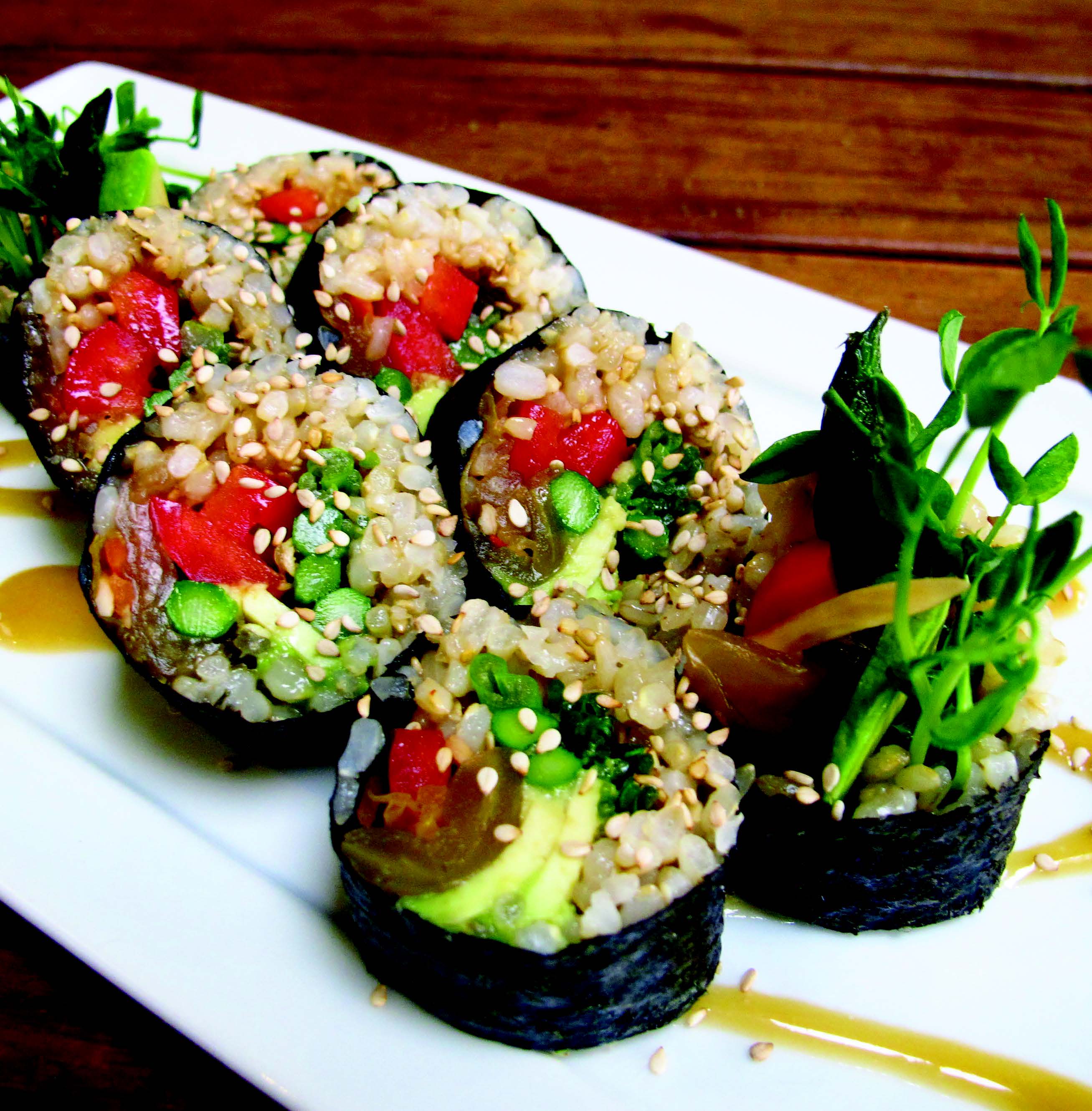 This rice roll has been on the Real Food Daily menu since we opened and has always been a favorite because guests are amazed and delighted that sushi can be vegan. We follow the traditional format of rolling rice in nori sea vegetable, but we fill it with an assortment of vegetables, along with some flavorful condiments. Our culinary director, Tara Punzone, created this variation, incorporating her love of pickled vegetables. We like using some of the exotic rice in the marketplace today. If you can’t source jade pearl rice, white sushi rice is an easy substitute.
