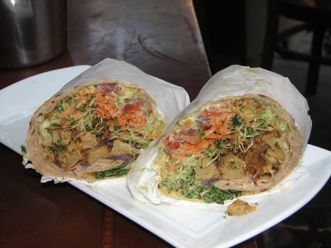 Honorable mention to their Vegan Shawarma Burrito wrapped in a whole wheat tortilla. The wrap includes lettuce, salsa (tomato based), green tahini, grilled onion, sprouts, pinto beans, wild rice, bell pepper, mustard, thin sliced carrot. Slathered in creamy green tahini sauce, this was heaven.