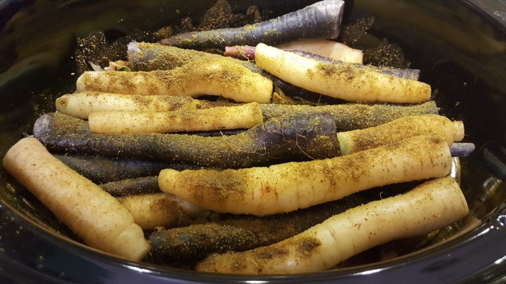 I rinsed and cleaned the carrots and layered them on top of all. I sprinkled the SPICELY seasoning over the carrots, turned the slow cooker onto LOW and left for work.