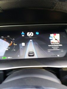 Auto Pilot! I was driving a Tesla Model S on the freeway. On a straight away, I clicked the lever (just like we enable highbeams, only twice) and the lines turned blue and the car was driving itself on the freeway while I had NO hands on the wheel and NO feet on the pedals, going 6o MPH ON THE FREEWAY IN TRAFFIC. Tesla has released it’s new Auto Pilot feature. Wow.