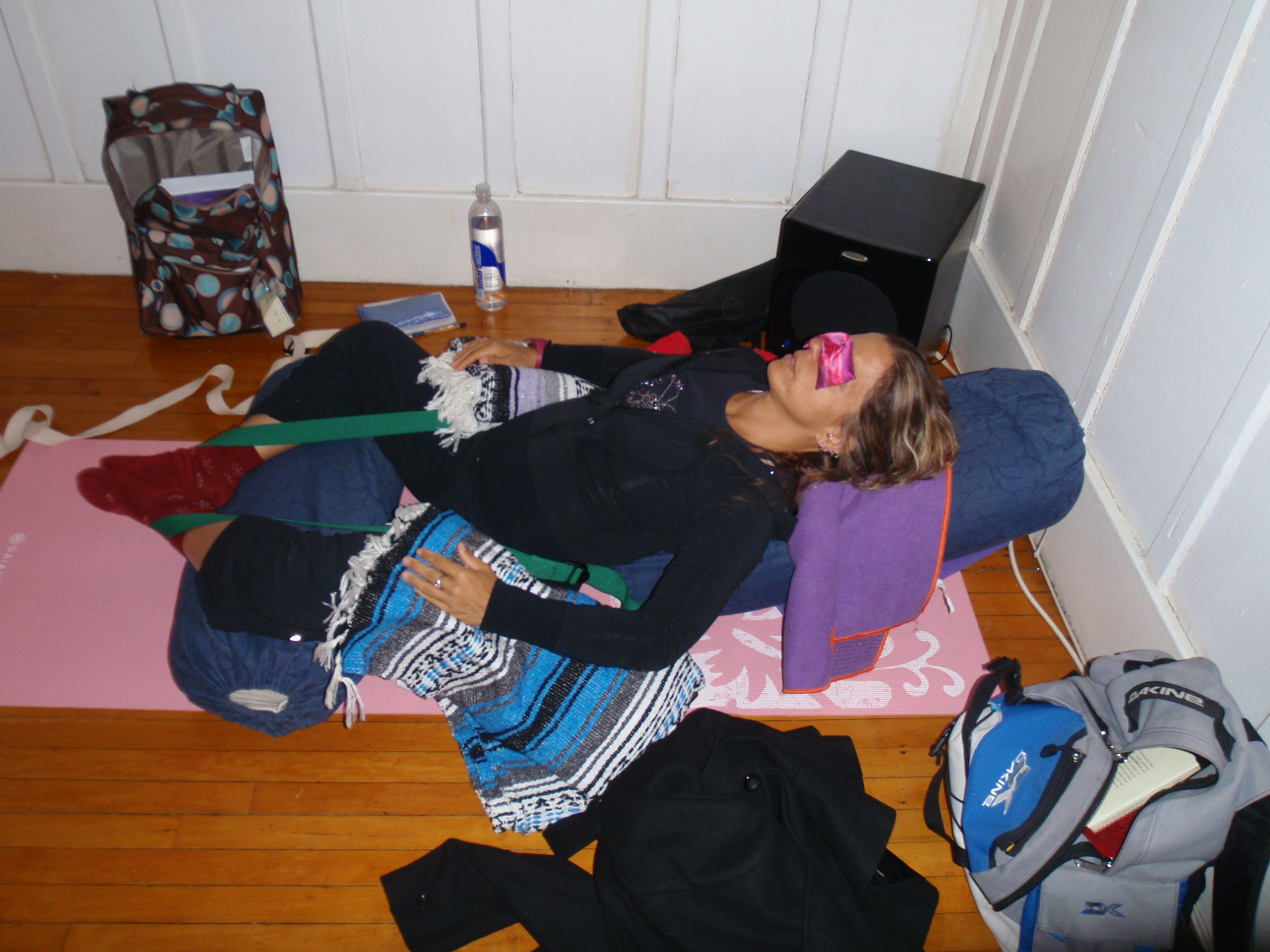 This is not a photo of a yoga hostage, this is me in my favorite supported cobbler’s pose with my fancy fuchsia eye pillow (sorry my socks don’t match)…I am completely supported like I am floating in water…my knees do not touch the ground but I am supported by blankets and pillows. This is still cobbler’s pose to open the hips, but WAY more comfortable.